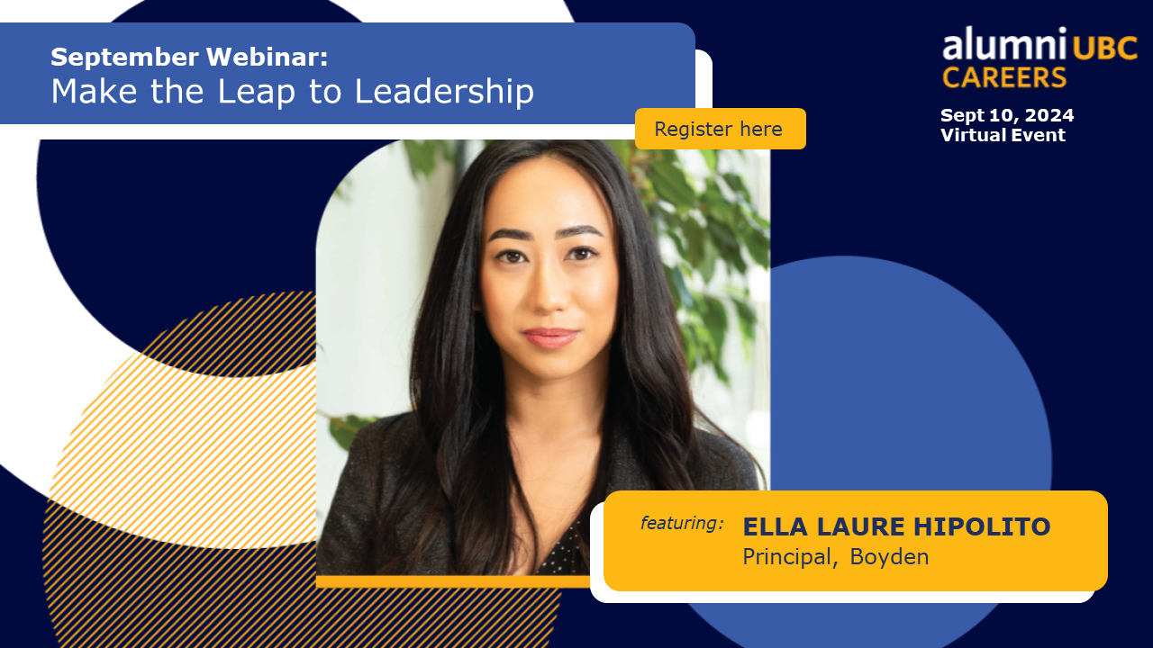 Boyden's Ella Laure Hipolito joins as keynote speaker of alumni UBC's September Webinar: Make the Leap to Leadership hosted by Rob Kim, Associate Director, Lifelong Learning.