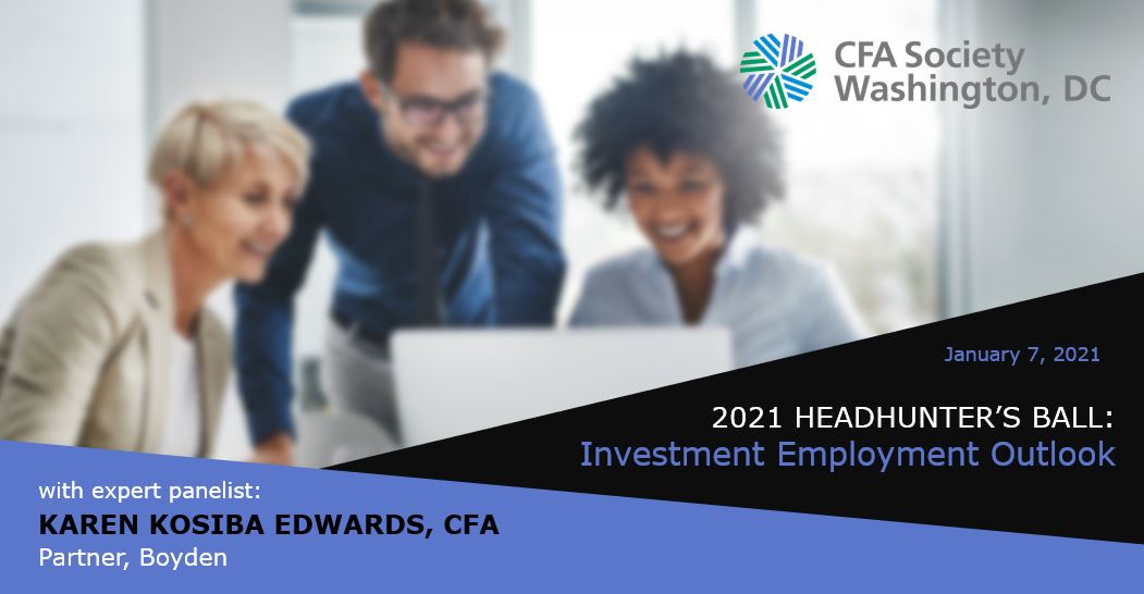 CFA Society Washington, DC’s 2021 Investment Professional Employment Outlook will tackle various employment topics. At this event, investment industry executive recruiters including Boyden Partner, Karen Kosiba Edwards, CFA, and local HR executives will provide color on the current hiring trends within the Finance and Investment industry, as well as their expectations for the upcoming year. We’ll explore which investment areas are growing the fastest and discuss issues of talent management from both the firm’s perspective as well as the employee’s perspective.