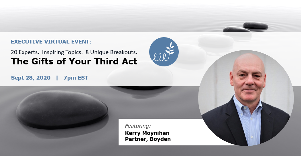 - Three different stories about life and career reinvention, how these leaders shaped purpose-driven "third acts": Pedro Caceres, Deborah Dugan and Steven Goldstein, led by distinguished executive search professional, Kerry Moynihan.