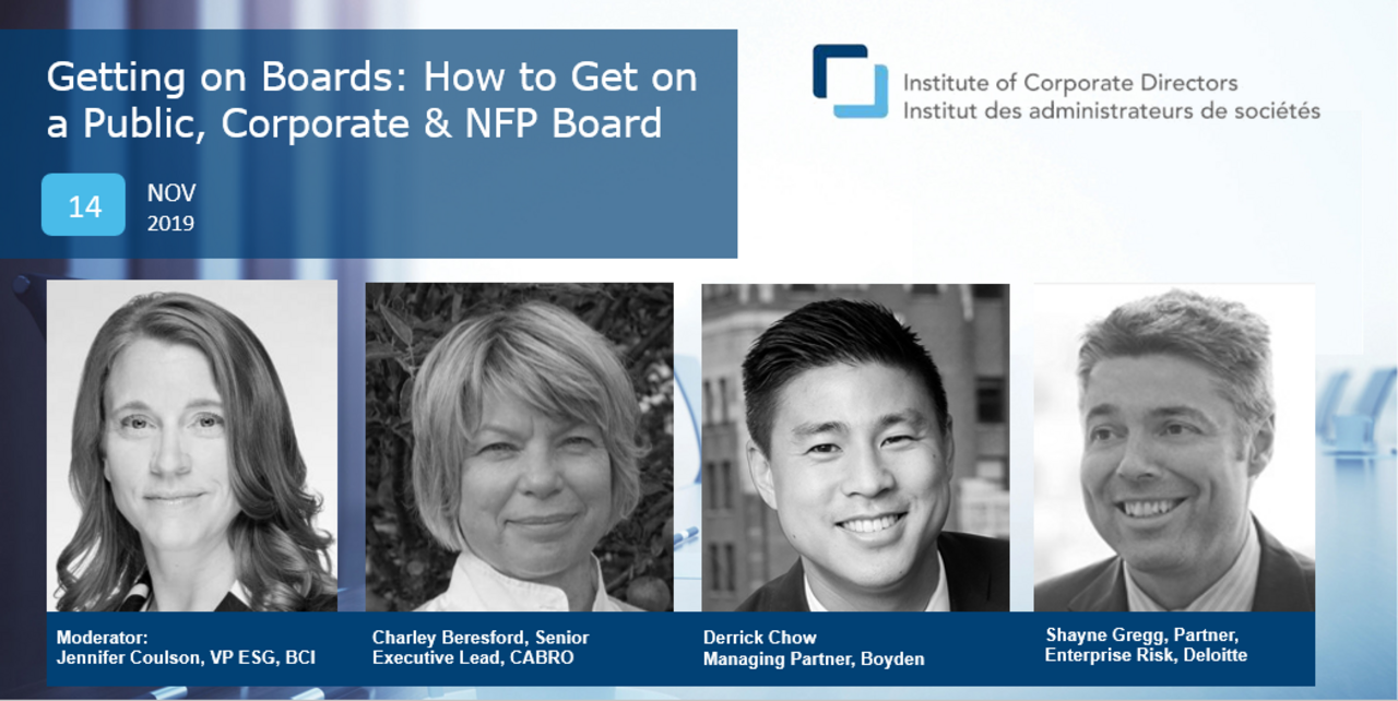 Learn more about the event here: https://www.icd.ca/Events/Upcoming-Events/BC-Chapter/2019-2020/Getting-on-Boards-How-to-Get-on-a-Public,-Corpora.aspx