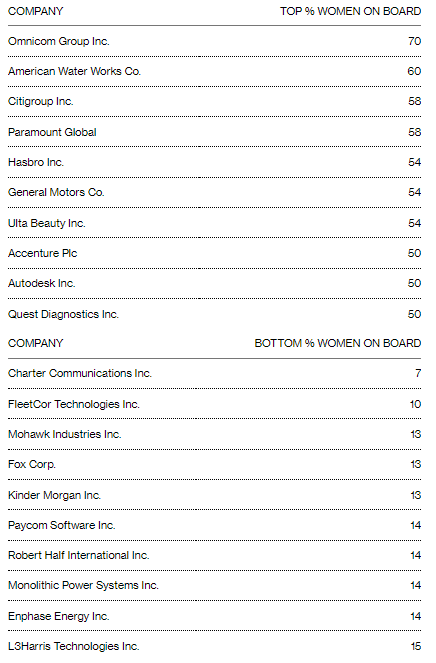 S&P 500 companies with the highest and lowest percentage of female board members: