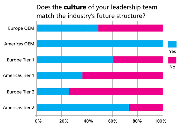 Half of European OEMs, 70 percent of European Tier 2s and over 60 percent of United States Tier 1s are struggling with aligning their culture to the future structure of the industry.