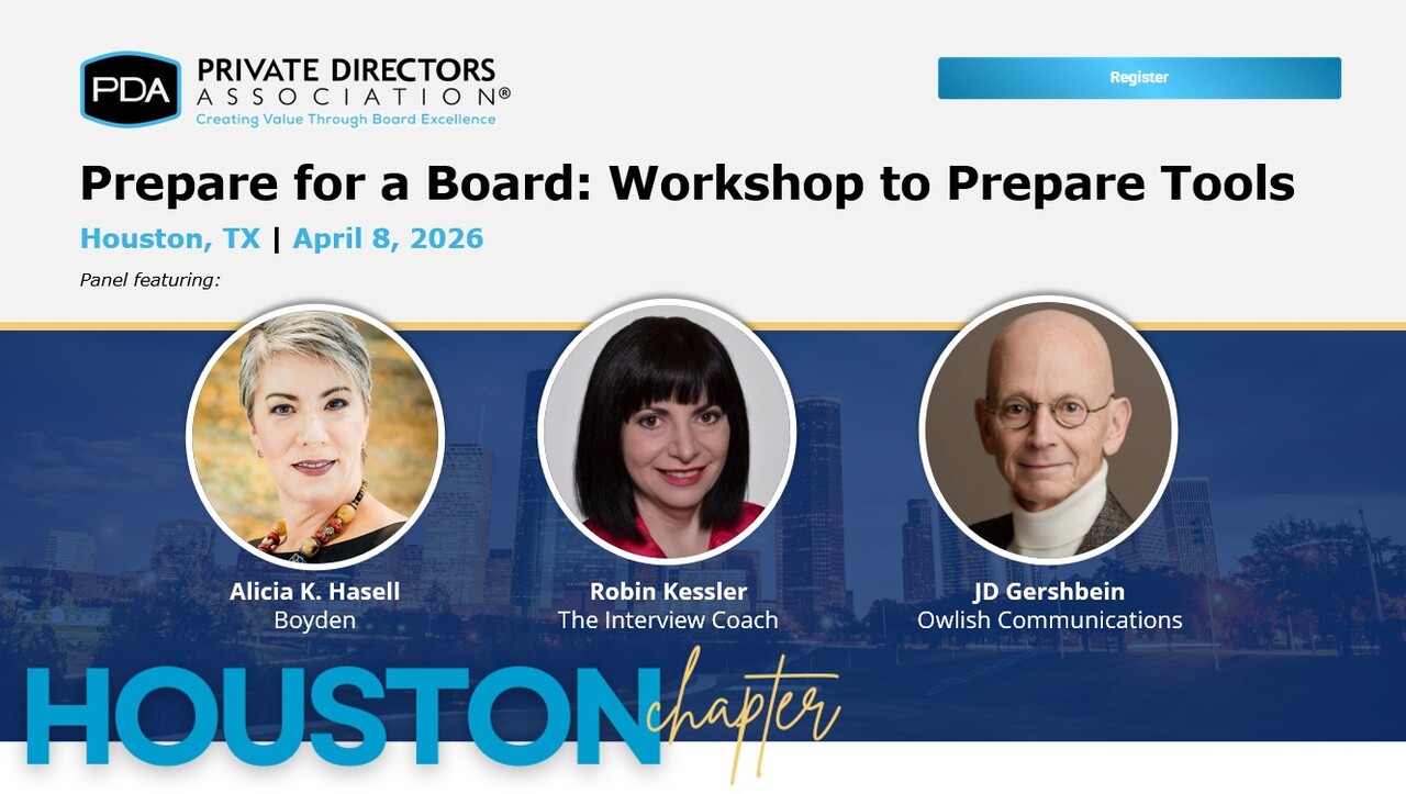 With more than 3,000 members, The Private Directors Association represents a diverse and highly experienced community of executive leaders, including current and qualified future board members, private company owners, C-level executives of family-owned businesses, ESOPs, private equity-backed companies, and early-stage ventures.