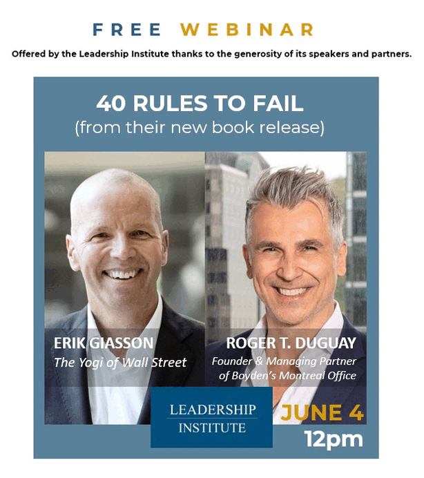 Based on their latest book, 40 Rules to Fail, Roger T. Duguay and co-author Erik Giasson will join this engaging Leadership Institute session to offer a reverse-psychology take on leadership.