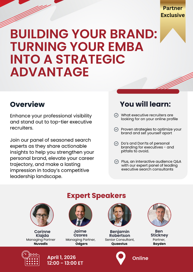 Join for an essential career-focused session designed to help you transform your EMBA into a powerful differentiator in the executive job market.