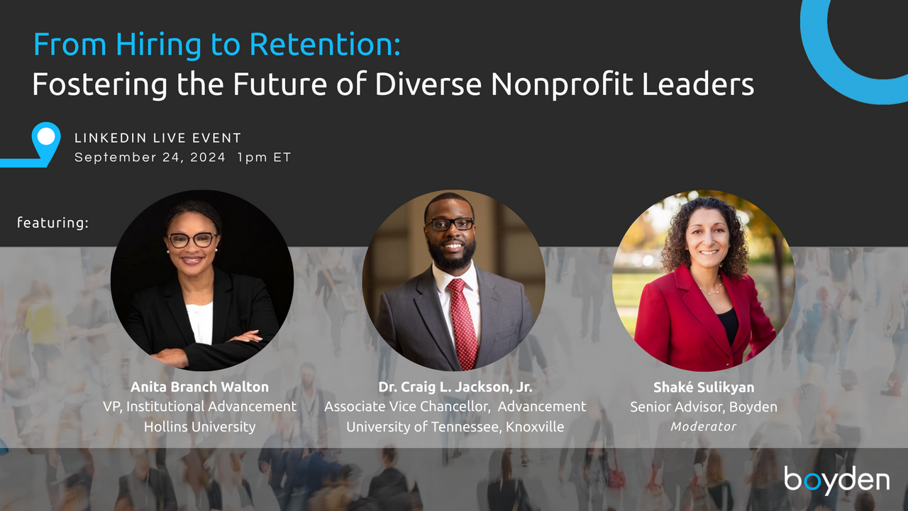 In this LinkedIn Live event, Dr. Craig L. Jackson, Jr., (Associate Vice Chancellor for Advancement, University of Tennessee, Knoxville) and Anita Walton (VP for Institutional Advancement, Hollins University) join Boyden Senior Advisor Shaké Sulikyan to discuss how to create spaces where candidates feel safe to ask questions and explore company culture. They’ll offer guidance on sharing personal values and building hiring practices that prioritize inclusivity. Audience members will also be able to participate through live Q&A and comments.