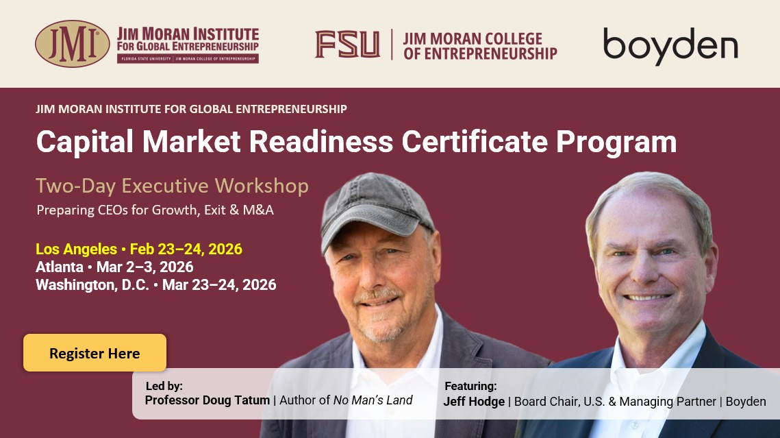 Boyden is pleased to share that Jeff Hodge, Board Chair, U.S. and Managing Partner will be joining the Jim Moran Institute for Global Entrepreneurship as faculty for its invitation-only Capital Market Readiness Certificate Program - a two-day deep dive designed for middle-market company owners and CEOs preparing for growth, exit, or M&A.