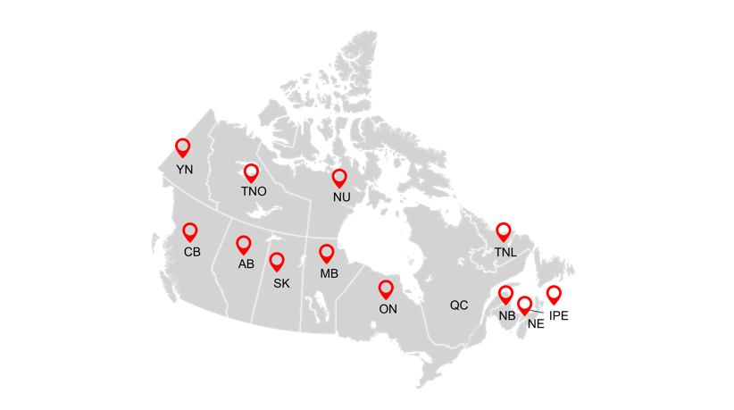 Alberta, Colombie-Britannique, Île-du-Prince-Édouard, Manitoba, Nouveau-Brunswick, Nouvelle-Écosse, Ontario, Saskatchewan, Terre-Neuve-et-Labrador, Nunavut, Territoires du Nord-Ouest, Yukon.
