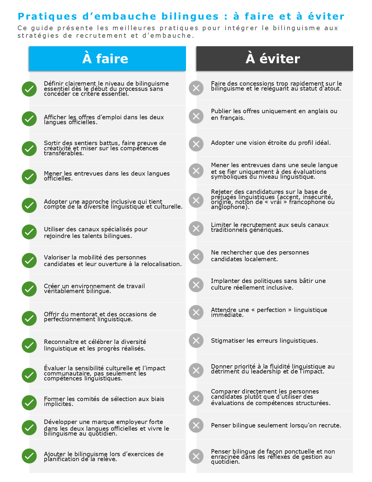Pour aider les organisations à naviguer à travers ces importants processus de recrutement de gestionnaires bilingues, le tableau ci-dessous présente les principales bonnes pratiques (« À faire ») ainsi que les erreurs fréquentes à éviter (« À éviter »). En suivant ces recommandations, les organisations renforceront leur capacité à attirer, évaluer et retenir des talents bilingues de haut niveau, assurant ainsi leur succès à long terme et un impact positif accru dans les populations desservies.