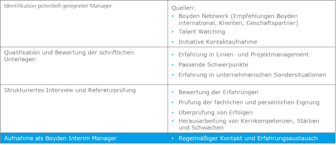 Wir investieren laufend in die Suche guter Interim Manager mit exzellenten Führungs- und Projekterfahrungen, die ausgewählte Erfolge nachwiesen können. Unser Netzwerk aus bestehenden Kontakten zu Managern, mit denen wir bereits erfolgreich gearbeitet haben und mit denen wir in regelmäßigem Austausch stehen, ergänzen wir ständig mit Führungspersönlichkeiten, die uns über unser Boyden Netzwerk empfohlen werden oder die wir im Rahmen unserer Marktbeobachtung identifizieren.