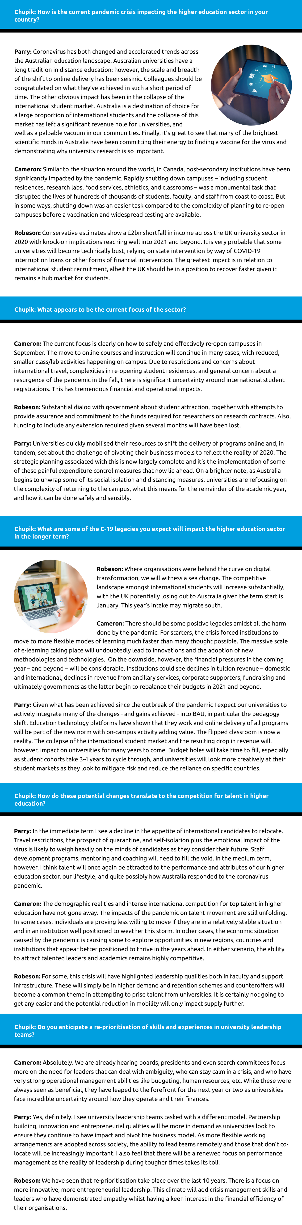 In conversation with Boyden Canada's Education Leader, Jessa Chupik, the discussion explores the immediate crisis impacts on higher education institutions, the demand for digital, anticipated long-term COVID-19 legacies, and how this translates into transformations within leadership.