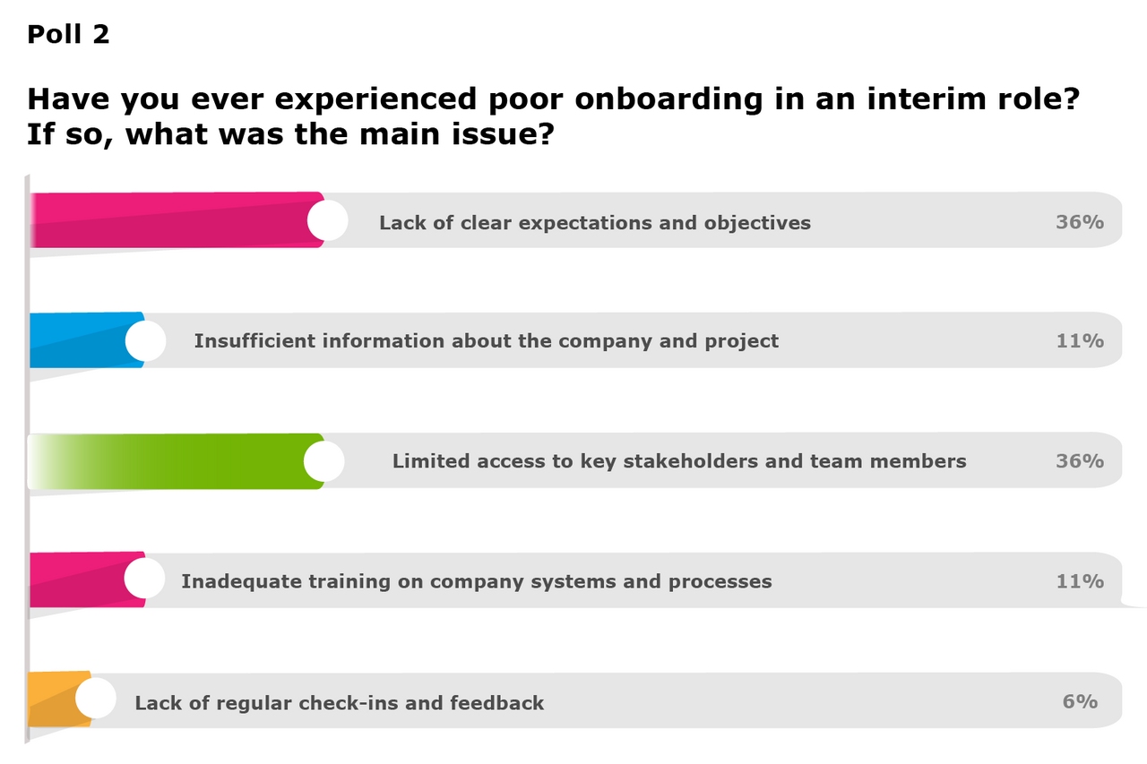 Poor onboarding experiences for interim managers are often due to a lack of clear expectations and objectives, as well as limited access to key stakeholders and team members, both cited by 36% of respondents. Insufficient information about the company and project, and inadequate training on company systems and processes, each account for 11% of the issues. A lack of regular check-ins and feedback is a problem for 6% of respondents.