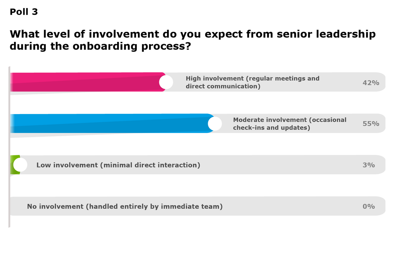 Interim managers expect moderate involvement from senior leadership during the onboarding process, with 55% favouring occasional check-ins and updates. High involvement, characterised by regular meetings and direct communication, is preferred by 42%. Only 3% of respondents desire low involvement, and none expect the process to be handled entirely by the immediate team.