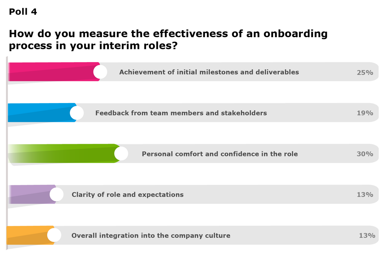 To ensure client’s utilise interim managers in the most effective way, we wanted to use the webinar to explore the interim’s experience of effective onboarding and the briefing processes. We explored these perspectives through a series of insightful poll questions, revealing key elements that contribute to successful interim engagements.
