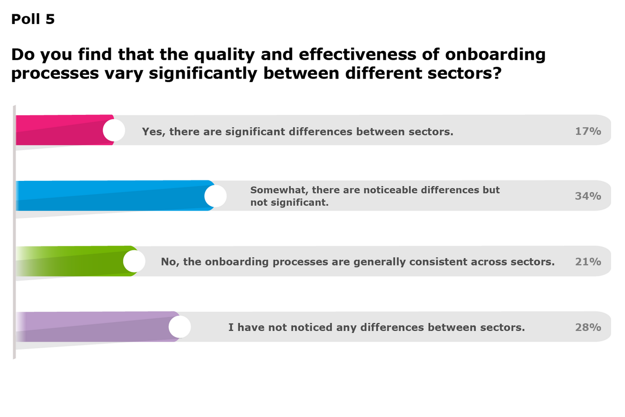 The quality and effectiveness of onboarding processes vary somewhat between sectors, according to 34% of respondents, though these differences are not seen as significant. Meanwhile, 28% have not noticed any differences and 21% believe the processes are generally consistent across sectors. Only 17% observe significant differences between sectors.