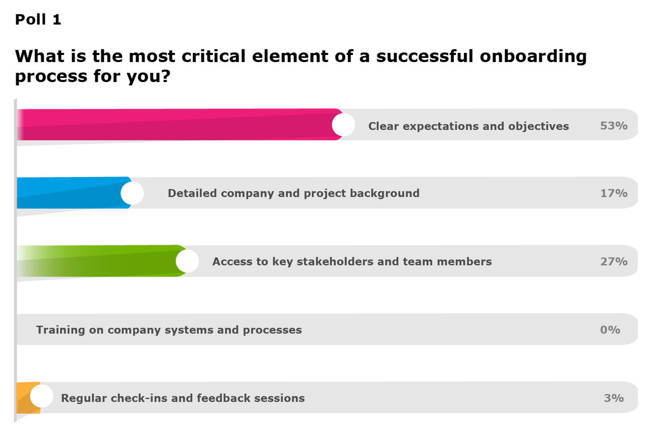 Poll 1: What is the most critical element of a successful onboarding process for you? 54% of participants selected “Clear expectations and objectives”. 17% of participants selected "Detailed company and project background”. 27% selected "Access to key stakeholders and team members”. 3% selected "Regular check-ins and feedback sessions”.