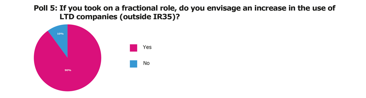 Our last poll question explored whether interim managers envisaged an increase in the use of Limited companies with fractional roles as they can be treated as true ‘consultancy’ compared with a full-time position, which may fall ‘inside IR35’. A resounding 90% thought that Limited companies could be utilised more due to the nature of the engagement which may increase its popularity among the interim management community.
