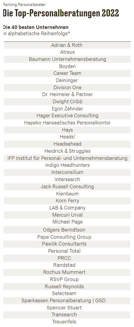 Zusätzlich wurden rund 25.000 Führungskräfte und Personalverantwortliche nach ihren Erfahrungen mit Personalberatungsunternehmen befragt. Die gewichteten Stimmen der Peergroup und der Entscheider bilden die Basis für die Auswahl der 40 Top-Personalberatungsunternehmen 2022.