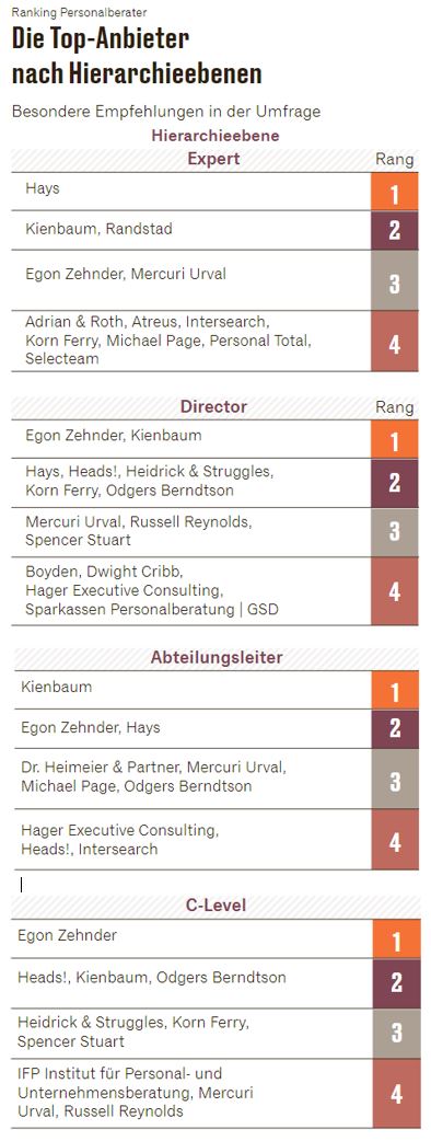 Das Handelsblatt Research Institute betrachtete in Zusammenarbeit mit zwei etablierten Analyseunternehmen kleine und mittelständische sowie internationale Personalberatungsgesellschaften. Dabei ergab sich eine beachtliche Peergroup von mehr als 15.500 Mitarbeitern aus rund 2.800 Personalberatungsfirmen. Sie konnten die renommiertesten Personalberatungsunternehmen nennen und eine Empfehlung für Branchen, Funktionen, Ebenen und Gehaltsstufen aussprechen.