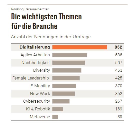 Doch welche Personalberatung ist empfehlenswert, wenn es darum geht, Posten bis hin zum Geschäftsführer und Vorstand zu besetzen? Fragen wie dieser ist das Handelsblatt Research Institute (HRI) in einer Studie nachgegangen. Es ermittelte dabei auch die drängendsten Themenfelder der Branche: Digitalisierung, agile Arbeit, Nachhaltigkeit und Diversity (siehe letzte Grafik).