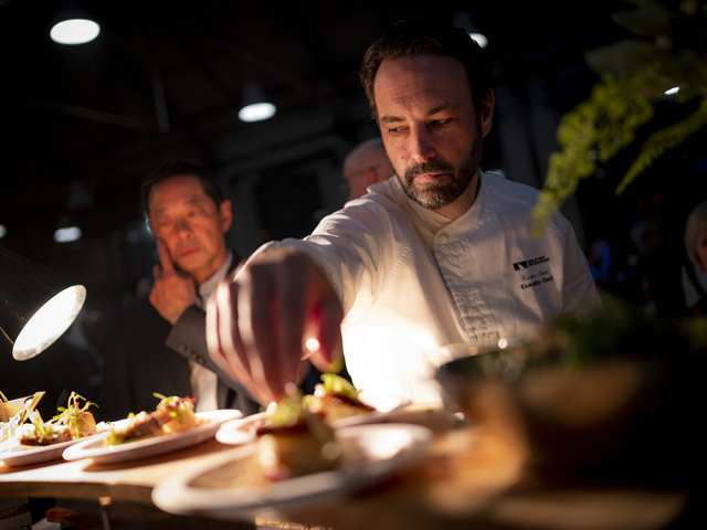 Chef Kenton Leier of the National Arts Centre works on his dish Wednesday evening