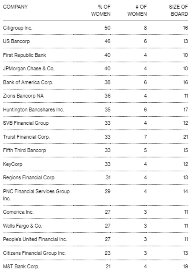 S&P 500 Banks Index companies ranked by percentage of female board members