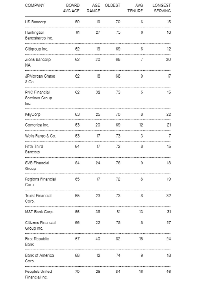 S&P 500 Banks Index companies ranked by percentage of female board members (left image) & here are the details on the ages of board members and their tenures (right image):