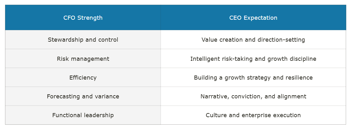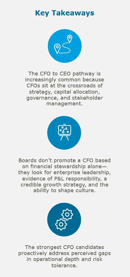 - Stakeholder management credibility. The CFO has already built deep relationships with the board of directors, institutional investors, lenders, and regulators, exactly the stakeholder set a CEO must manage.